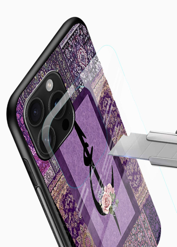 A bold purple ornamental backdrop highlighted with elegant Arabic calligraphy. Crafted with high-gloss tempered glass and durable shock-absorbing edges.
