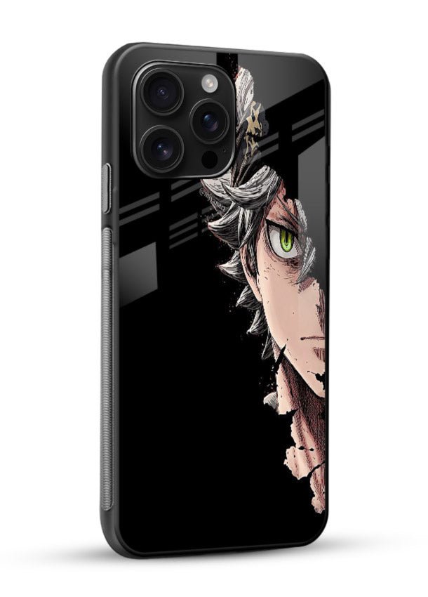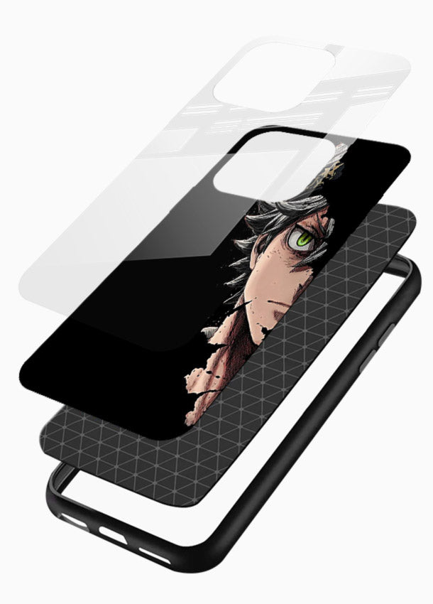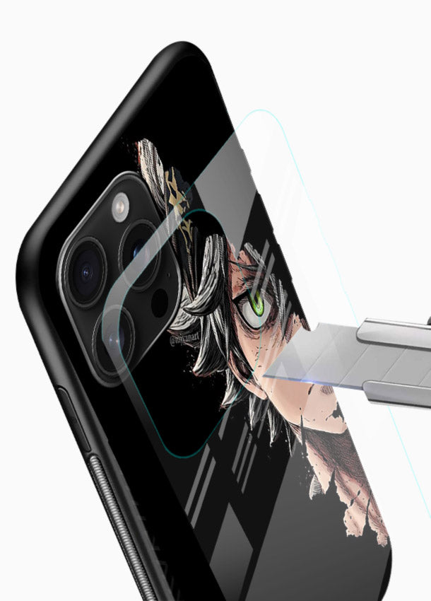 A powerful Mobile Glass glass cover featuring Astaโs demon-eye form, delivering dark, intense, strong and dramatic Black Clover anime style.