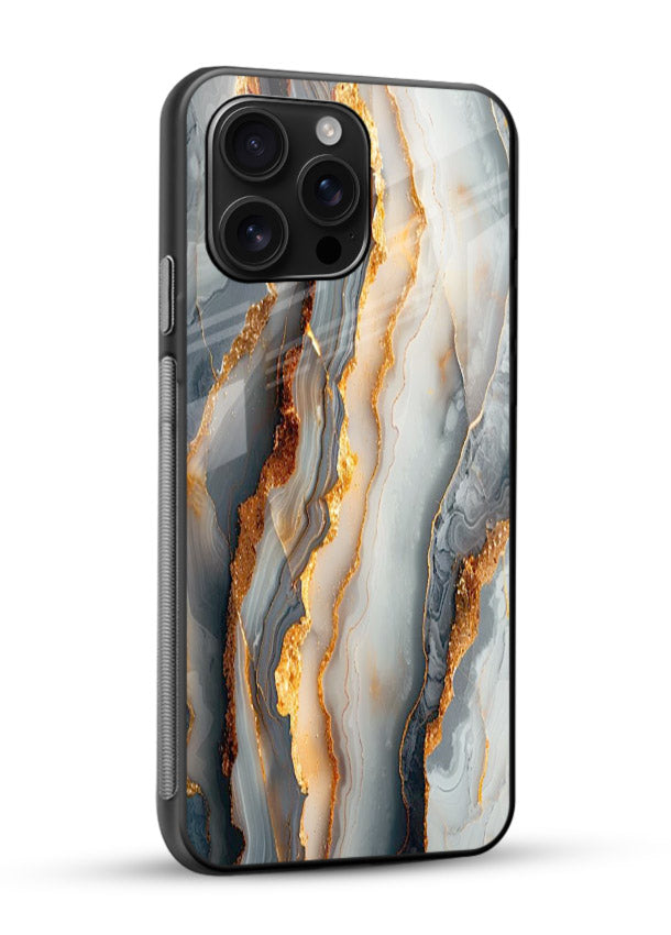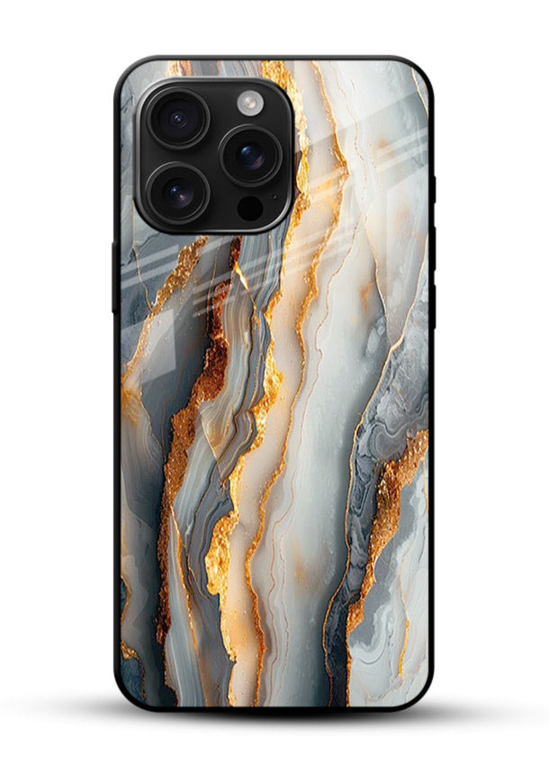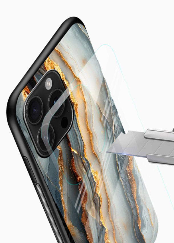Dark black marble layered with golden strata lines creates a bold luxury identity, giving your Mobile Glass a premium striking marble glass back cover.