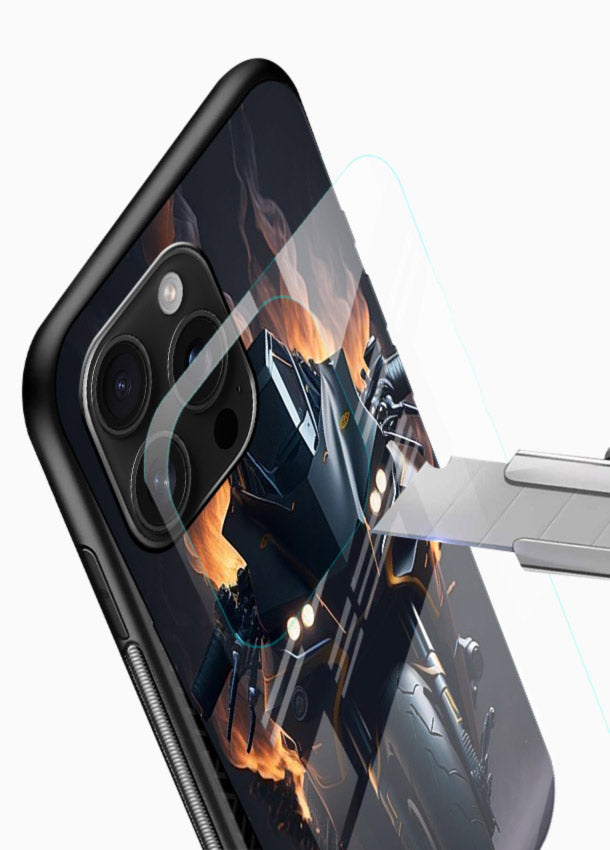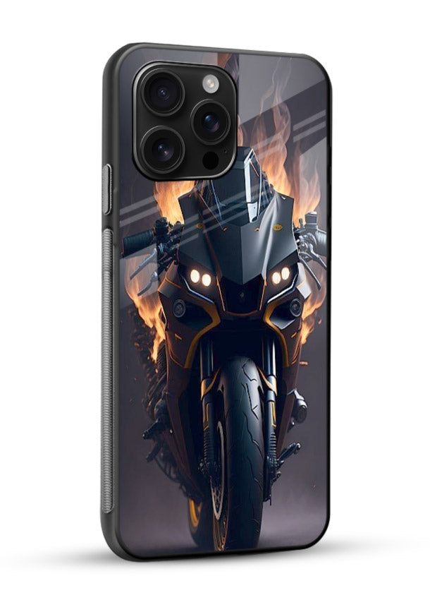 A fiery superbike emerging through flames for a bold high-adrenaline racing vibe. Crafted on premium tempered glass with glossy finish and shock-absorbing protective edges.