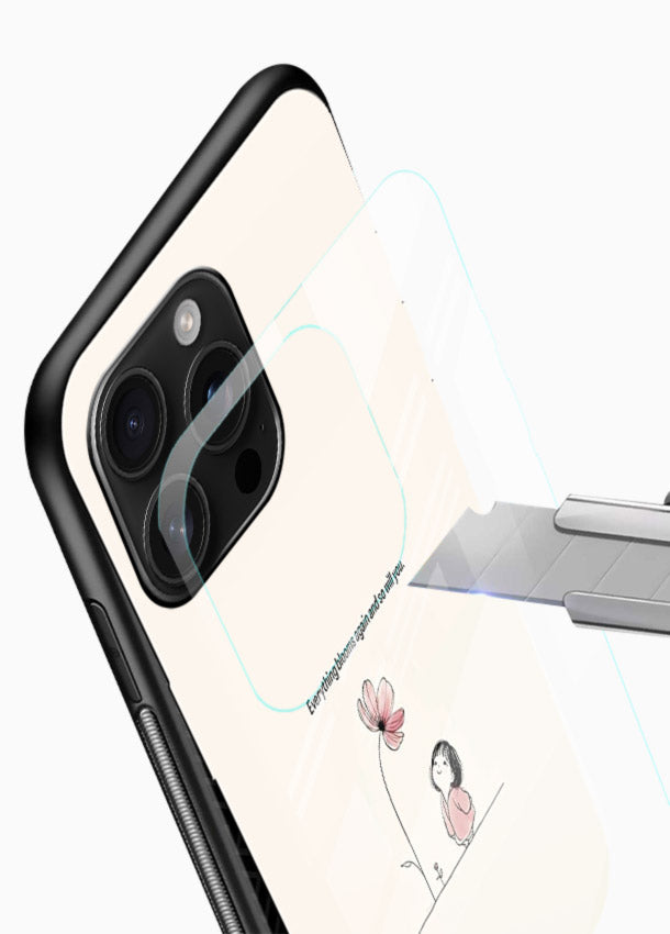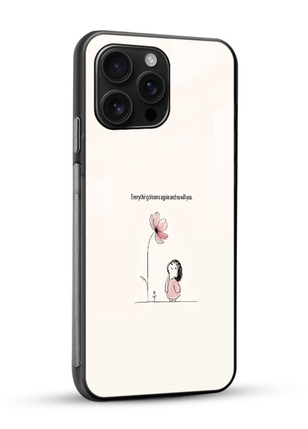 A tiny sketched girl beside a delicate flower brings gentle courage and emotional warmth to your Mobile Glass glass back cover, encouraging bravery, softness, and hopeful growth.