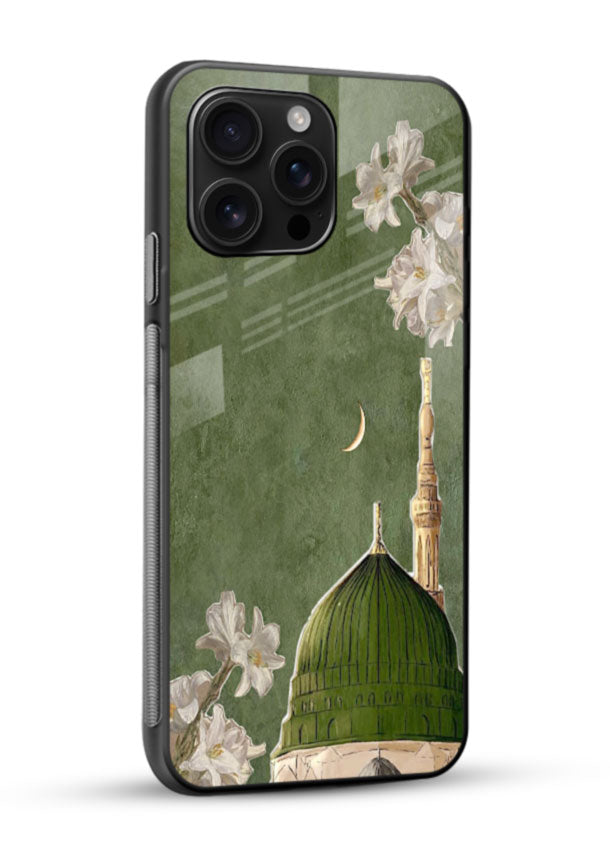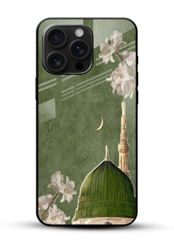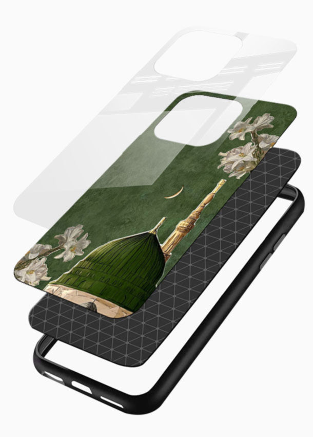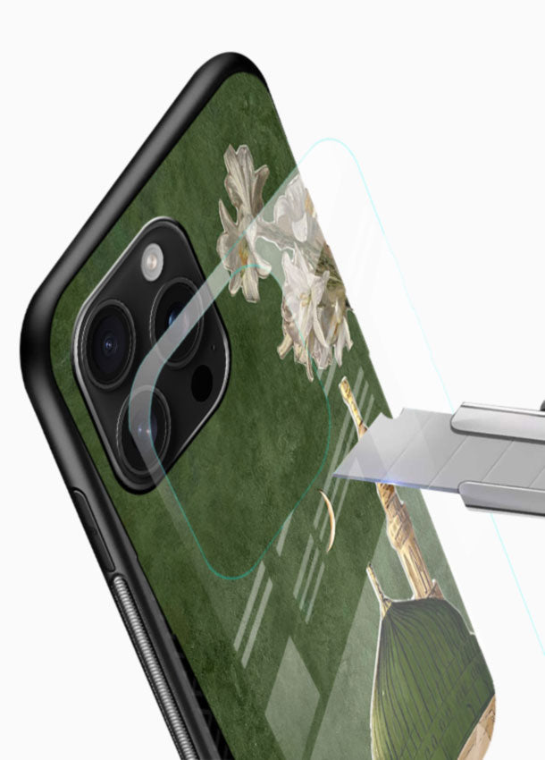 A graceful floral design inspired by the beauty of Madinah, blending nature with spiritual serenity. Premium glass back cover with shockproof frame, lens protection, reinforced corners and slim stylish finish for daily safety.