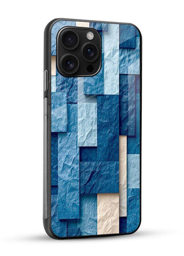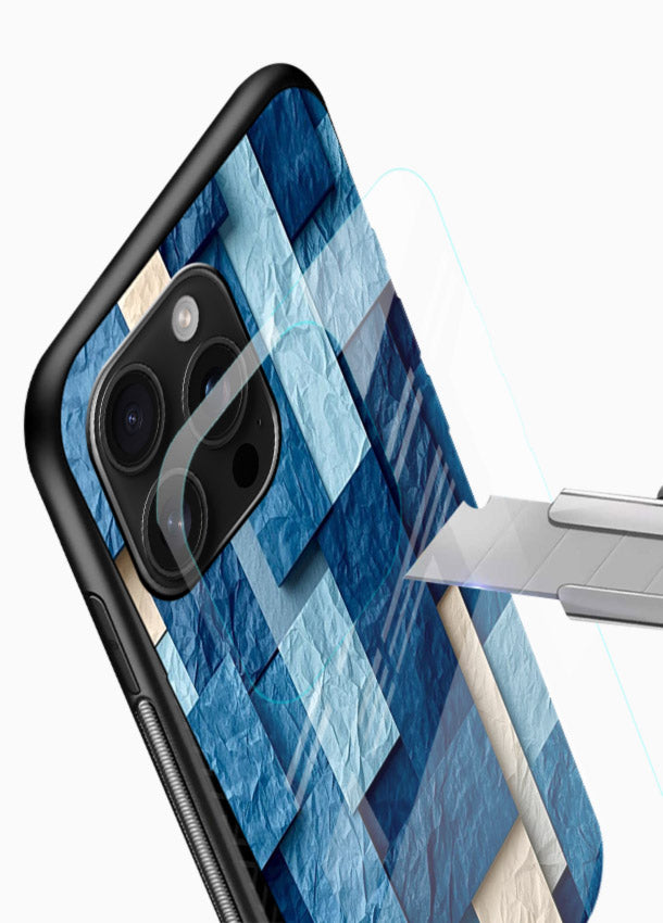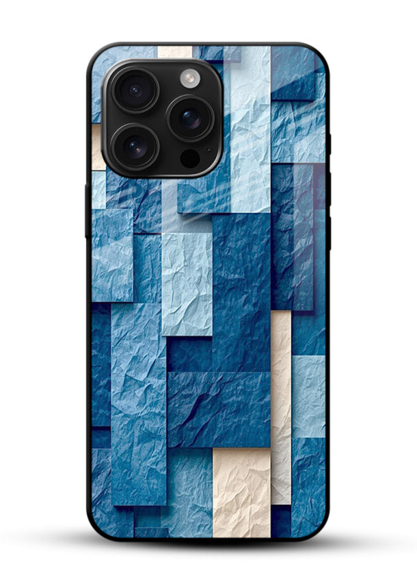 Abstract block pattern with layered blue textures creating a bold modern aesthetic, perfect for styling your Mobile Glass with a premium pattern glass back cover.