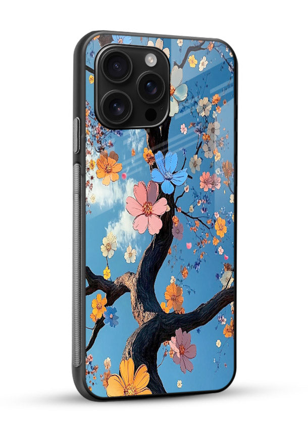 A diagonal blue blossom branch adds serene natural beauty to Mobile Glass with cool tones, soft shading, airy petals, and graceful botanical movement.