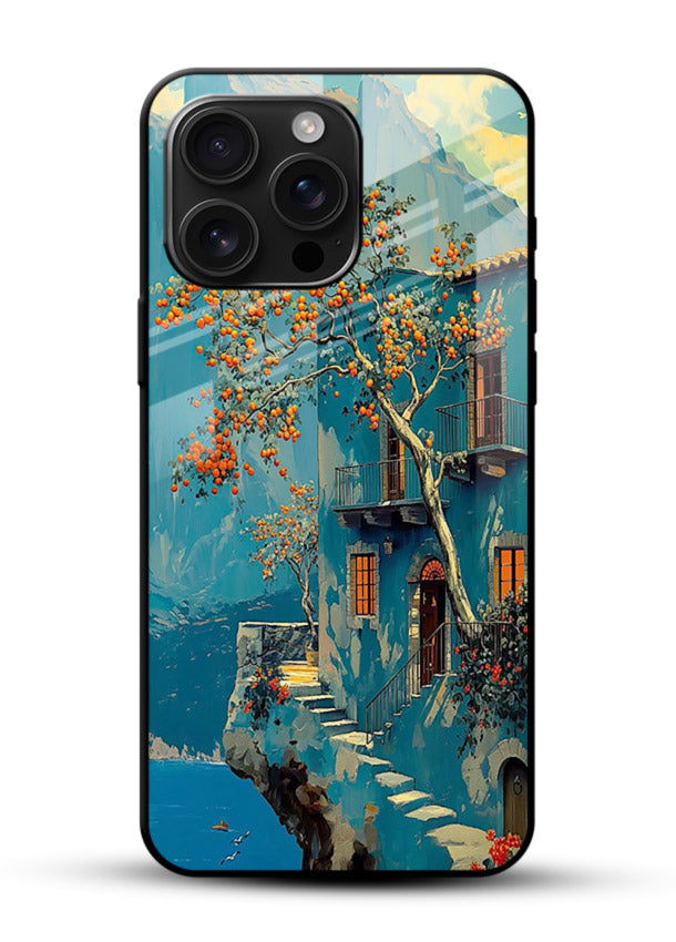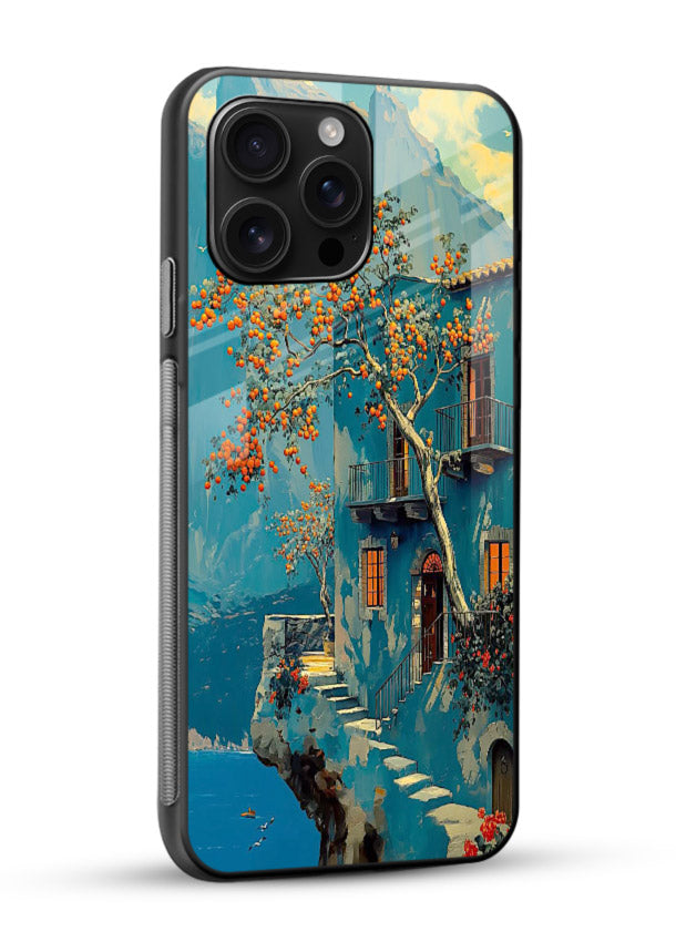 Blue Cliff Village coastal cliff village artwork glossy vibrant premium glass back cover - Angle Front