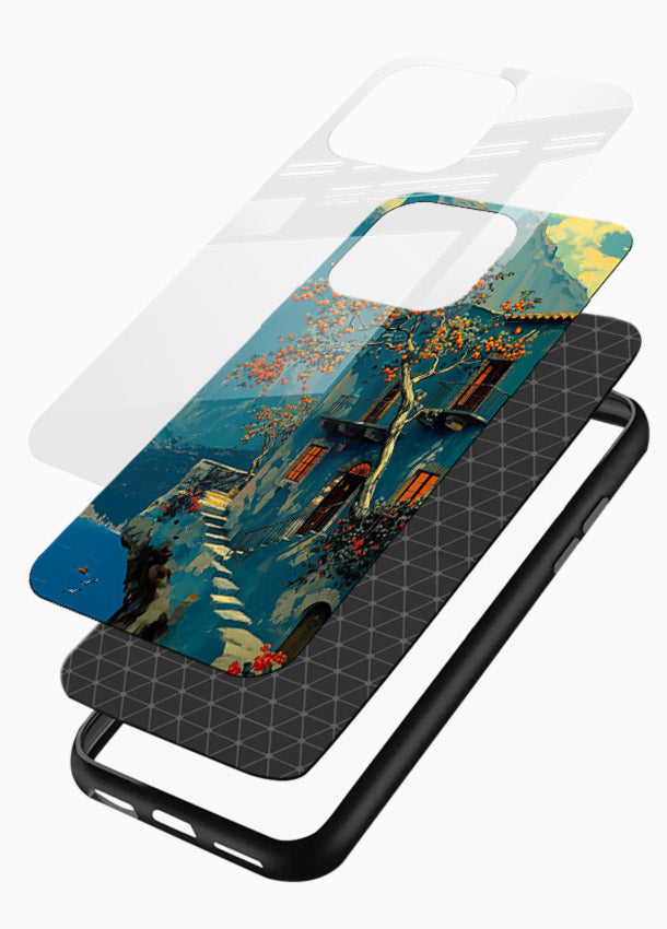 Blue Cliff Village coastal cliff village artwork glossy vibrant premium glass back cover - Angle Layers