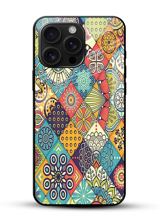 Artistic patch-style medley blending bold colorful segments and textured shapes, giving your Mobile Glass a vibrant expressive patterned glass back cover aesthetic.