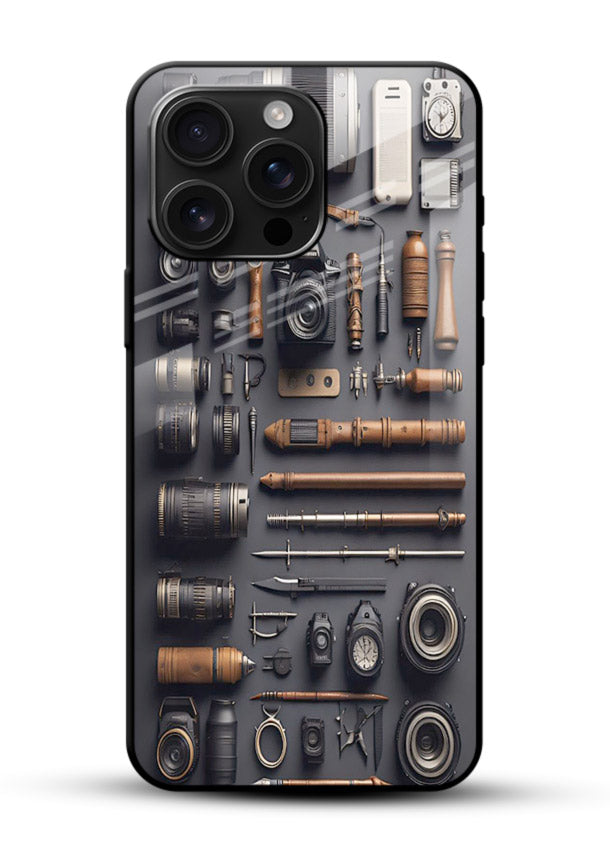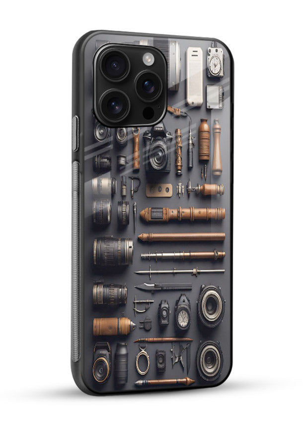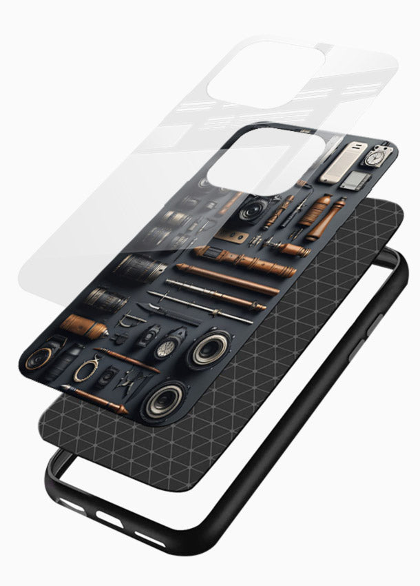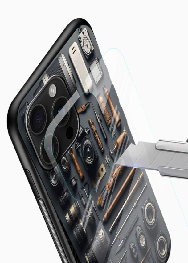 A detailed flatlay of camera and creative tools arranged in a sleek dark layout. Built on scratch-resistant tempered glass with glossy finish and protective bumper sides.
