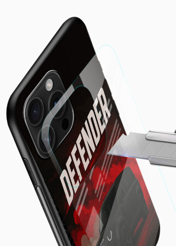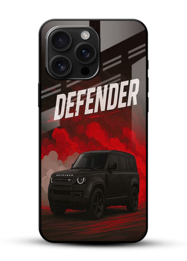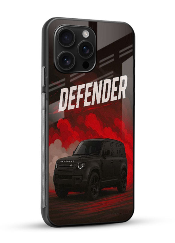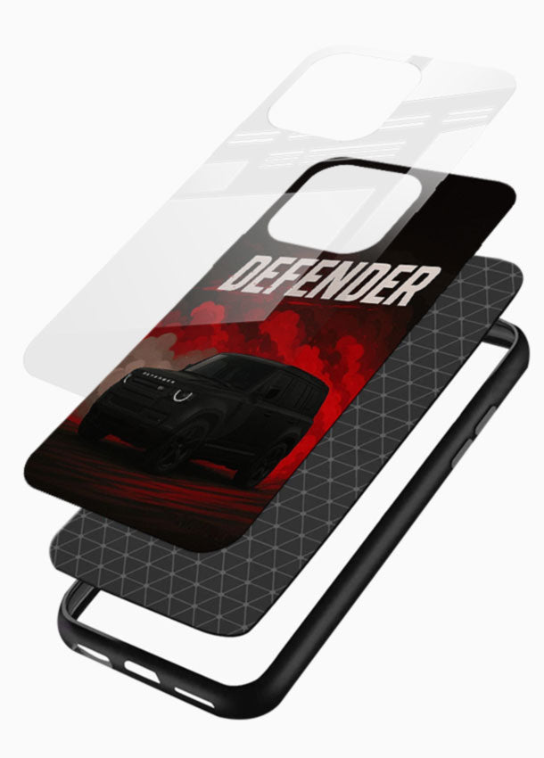 A rugged Land Rover Defender emerging through dark smoke for a powerful and bold SUV presence. Built with a premium glass finish back and shockproof frame for tough and reliable protection.