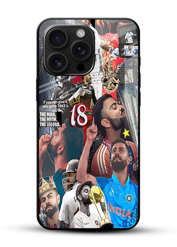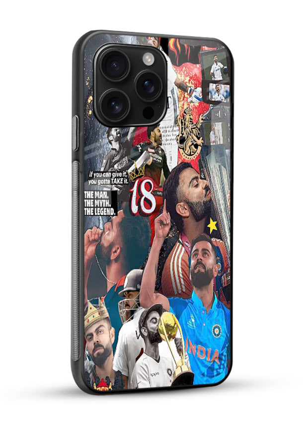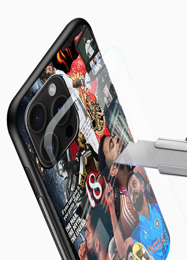 A dramatic cricket tribute featuring number eighteen with fiery intensity and passion. Built on scratch-resistant tempered glass with glossy finish and protective bumper sides.