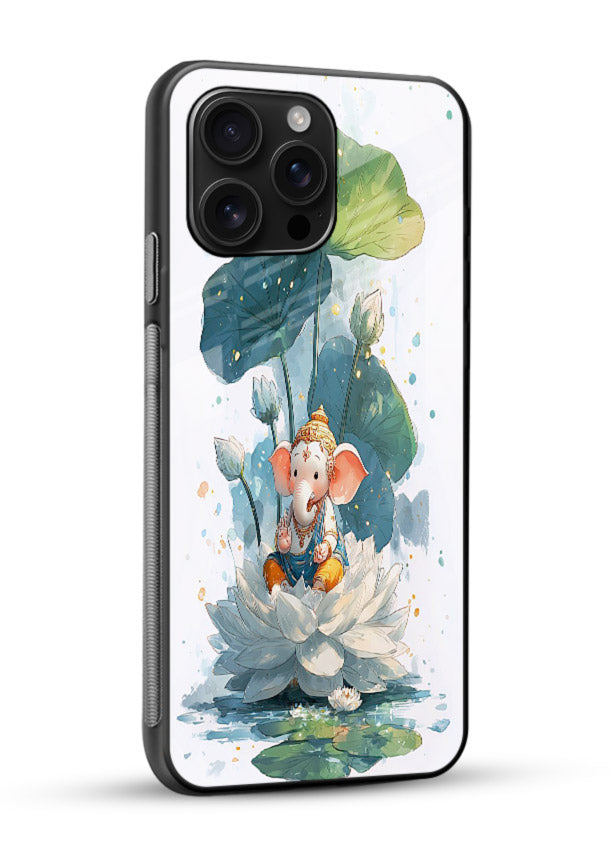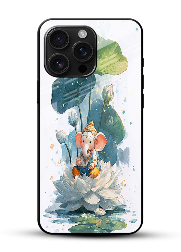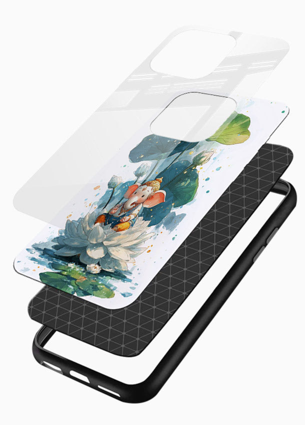 A cheerful Baby Ganesha sitting on a lotus brings blessings and positivity to your Mobile Glass. Perfect spiritual artwork for Ganesh devotees and art lovers.