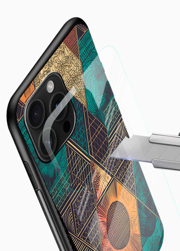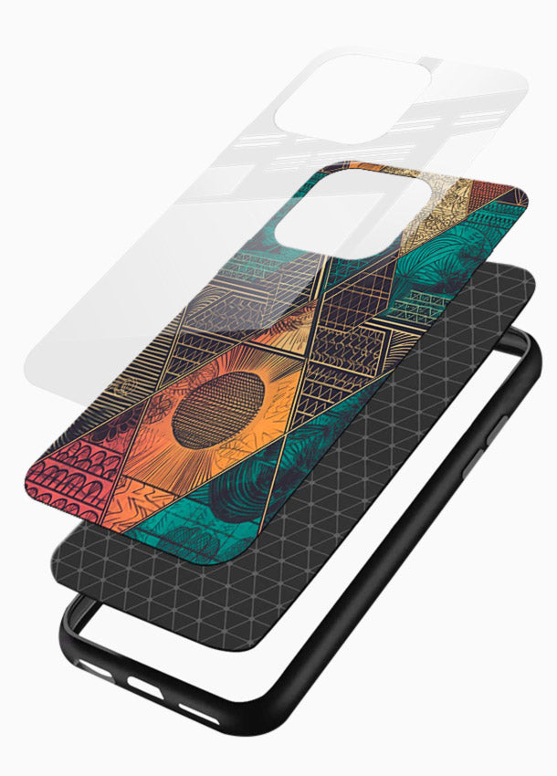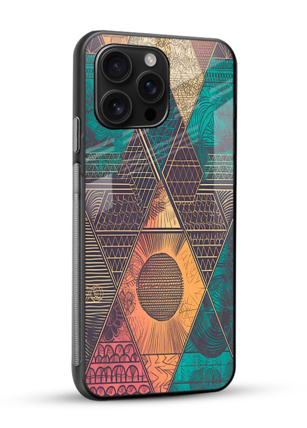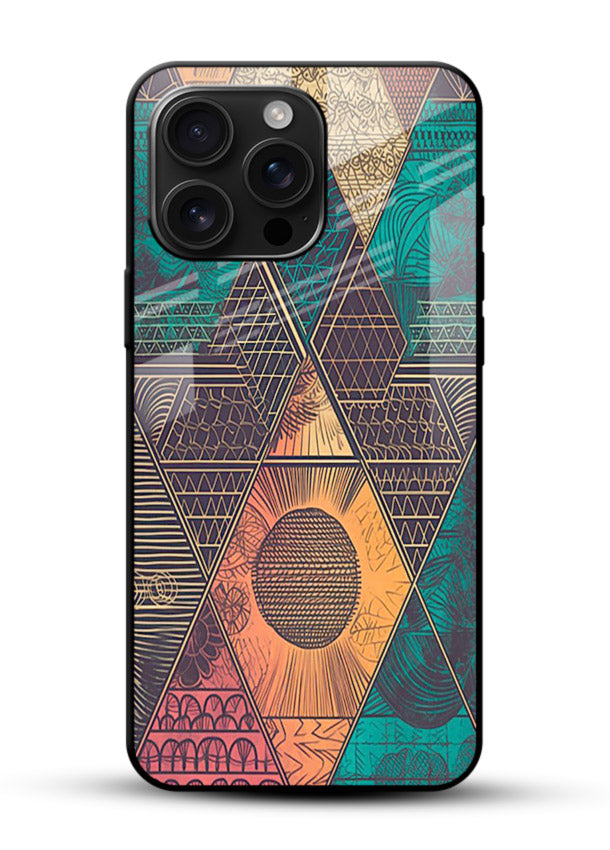 Tribal-inspired geometric pattern with sunset tones and layered symmetry, giving your Mobile Glass a bold cultural patterned glass back cover aesthetic.