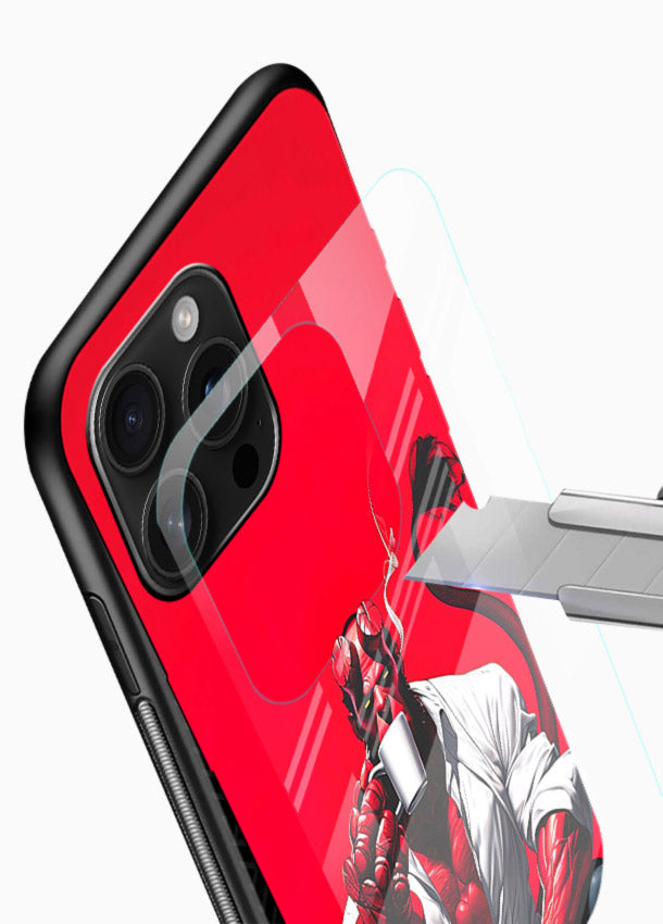 A bold Hellboy vigilante artwork in fiery red tones, presented as an glass back cover bringing supernatural intensity and comic-style drama to your phone.