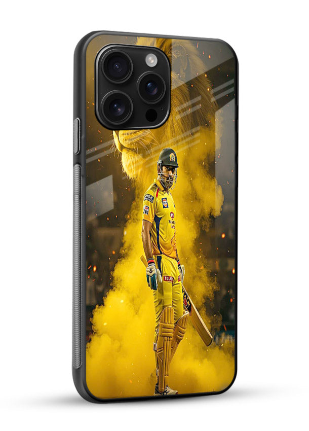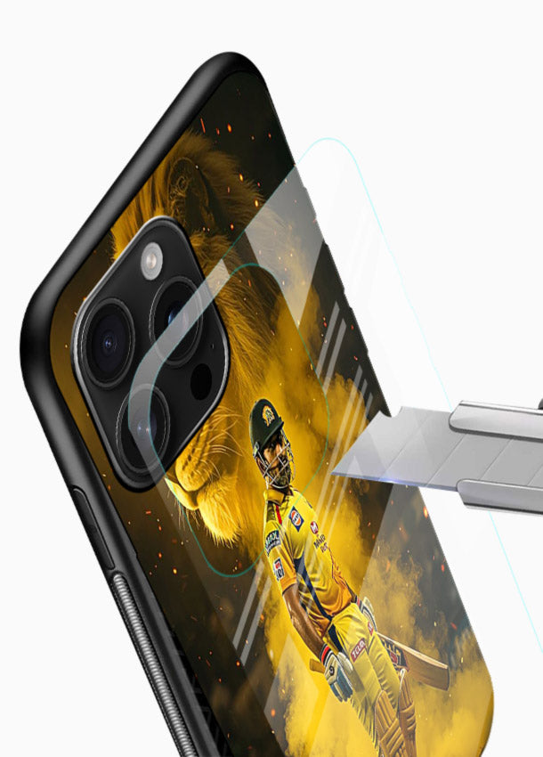 A dramatic golden lion and cricketer composition symbolizing courage and dominance. Crafted with high-gloss tempered glass and durable shock-absorbing edges.