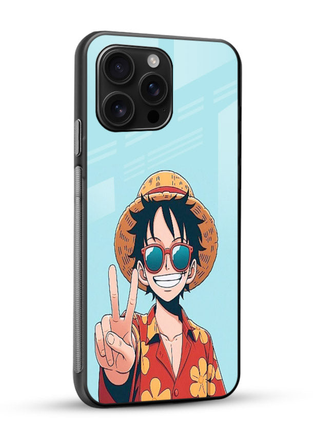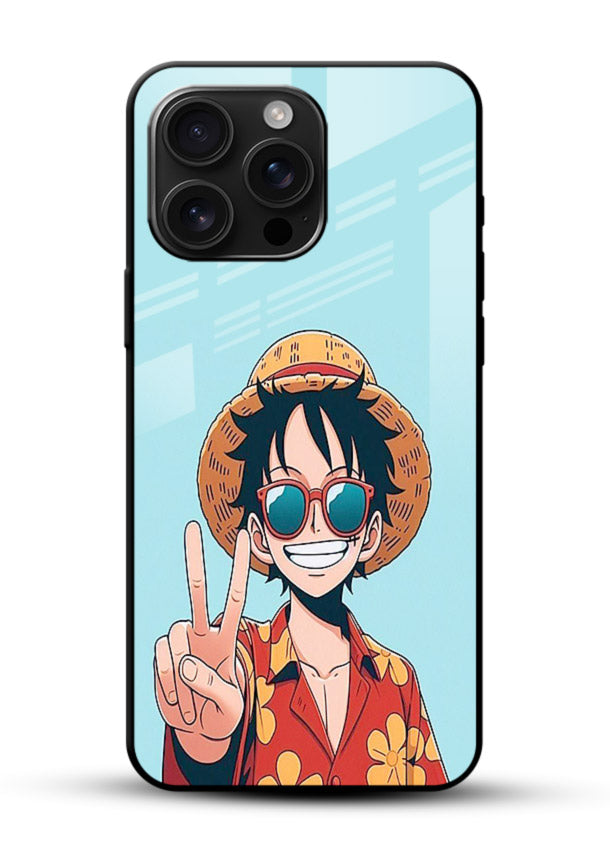 A cheerful Mobile Glass glass cover with Luffy flashing a peace sign, offering playful, bright, friendly and happy anime vibes.