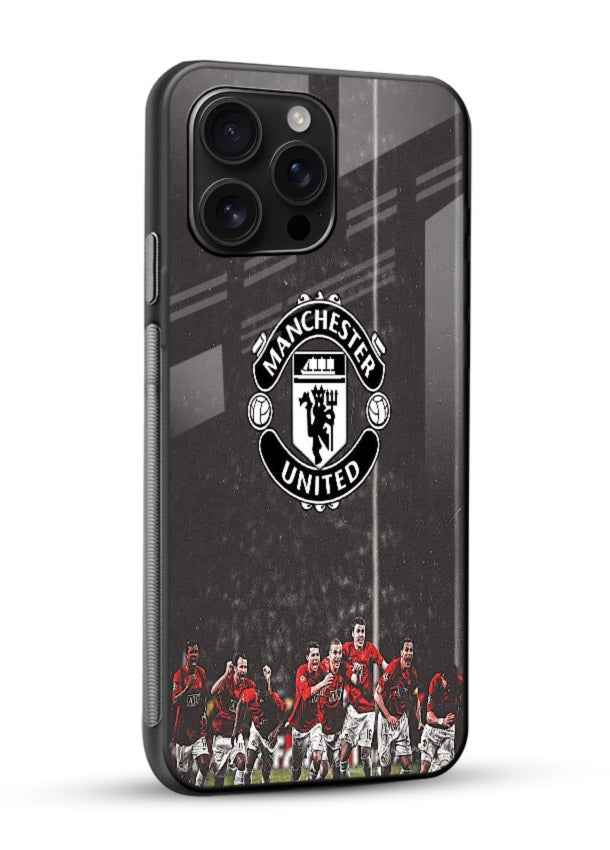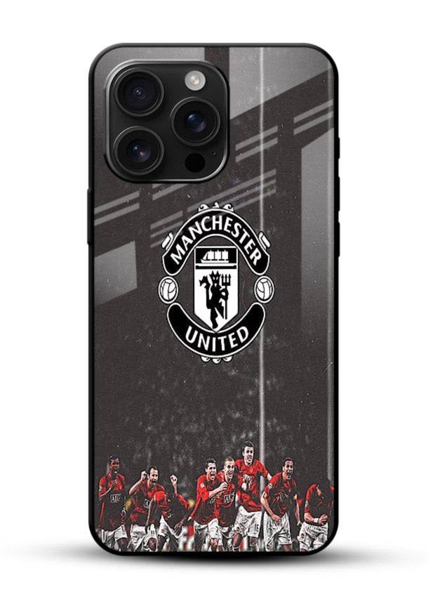 A dramatic football emblem with players beneath spotlight for a powerful legacy statement. Finished on durable tempered glass with crystal-clear print and shockproof sides.