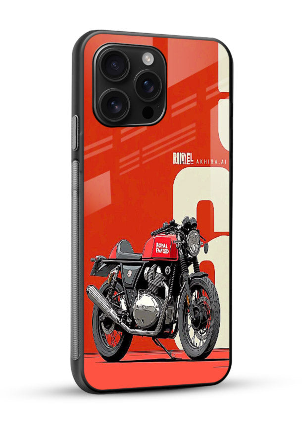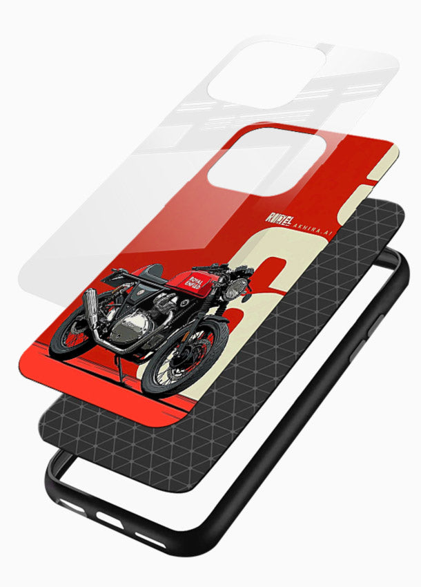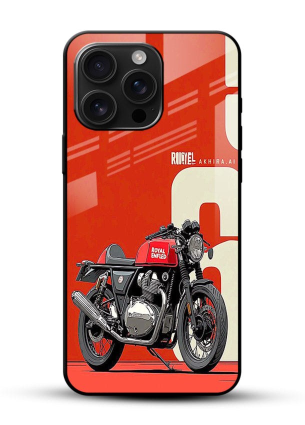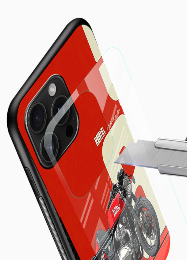 A clean red retro motorcycle layout on a bold minimal background for timeless appeal. Built on scratch-resistant tempered glass with glossy finish and protective bumper sides.