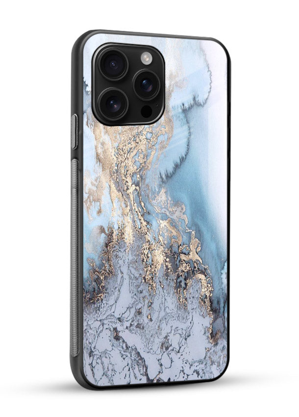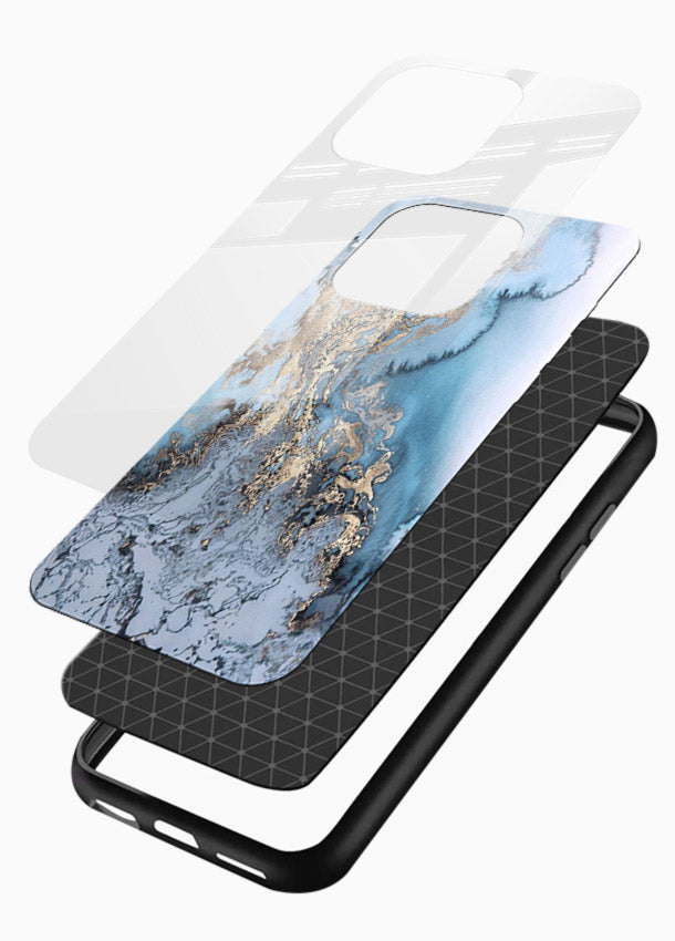 Cracked volcanic marble illuminated with molten gold shards forms a bold intense texture, giving your Mobile Glass an artistic fiery marble glass back cover.