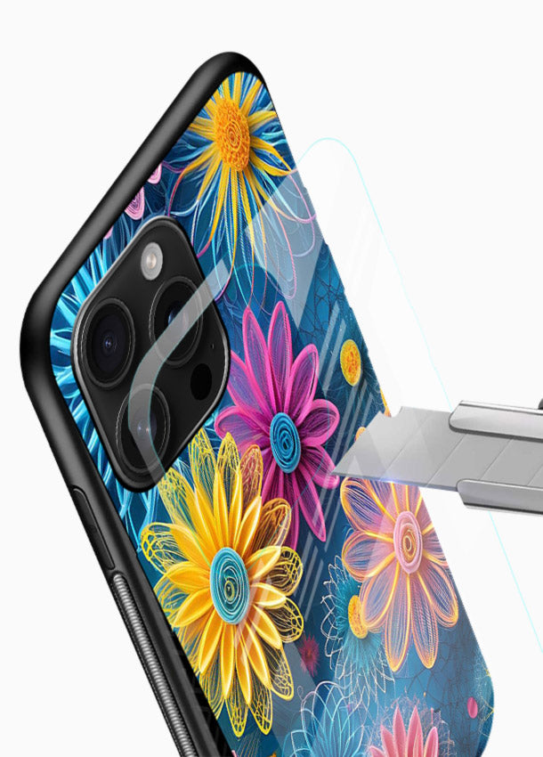 Bright neon floral burst pattern combining glowing petals and bold outlines to create a striking expressive aesthetic for your Mobile Glass pattern glass back cover.