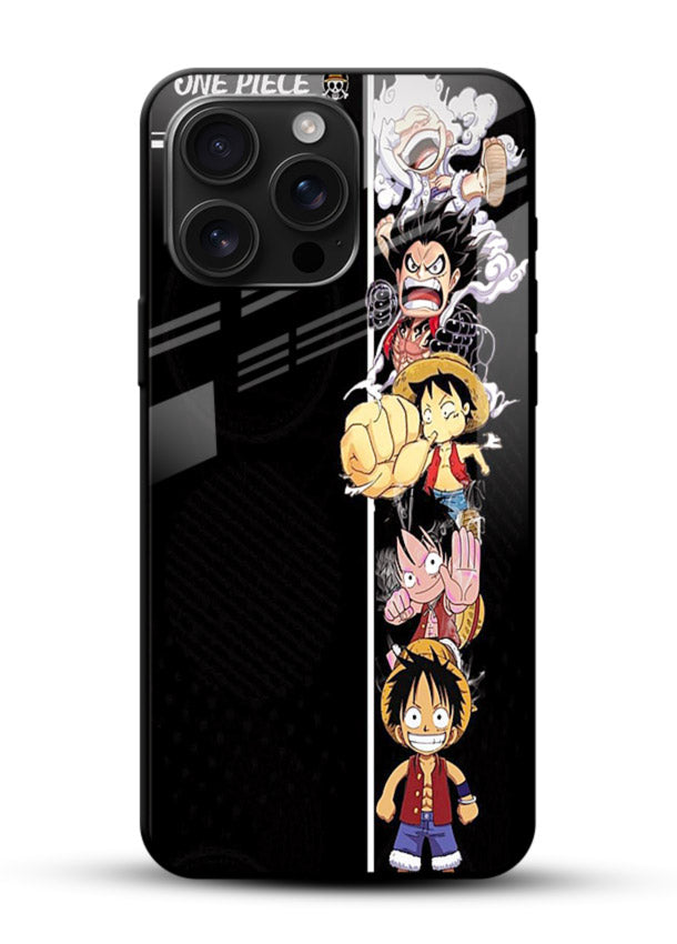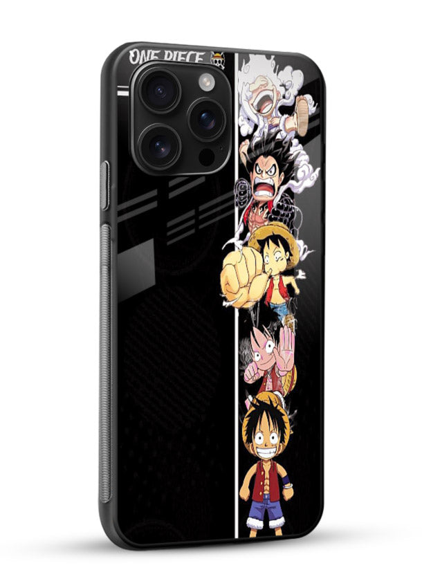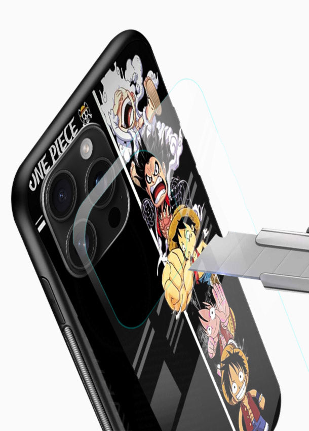 A striking Mobile Glass glass cover with split-panel One Piece characters, offering bold, expressive, dynamic and visually compelling anime artwork.