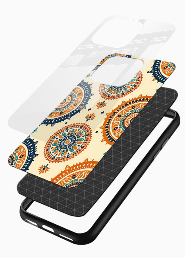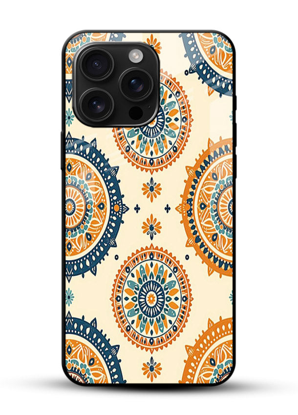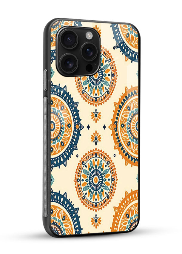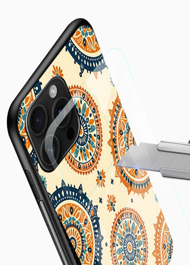 Vibrant orange mandala pattern with detailed symmetrical shapes, bringing bold cultural artistic energy to your Mobile Glass premium patterned glass back cover.