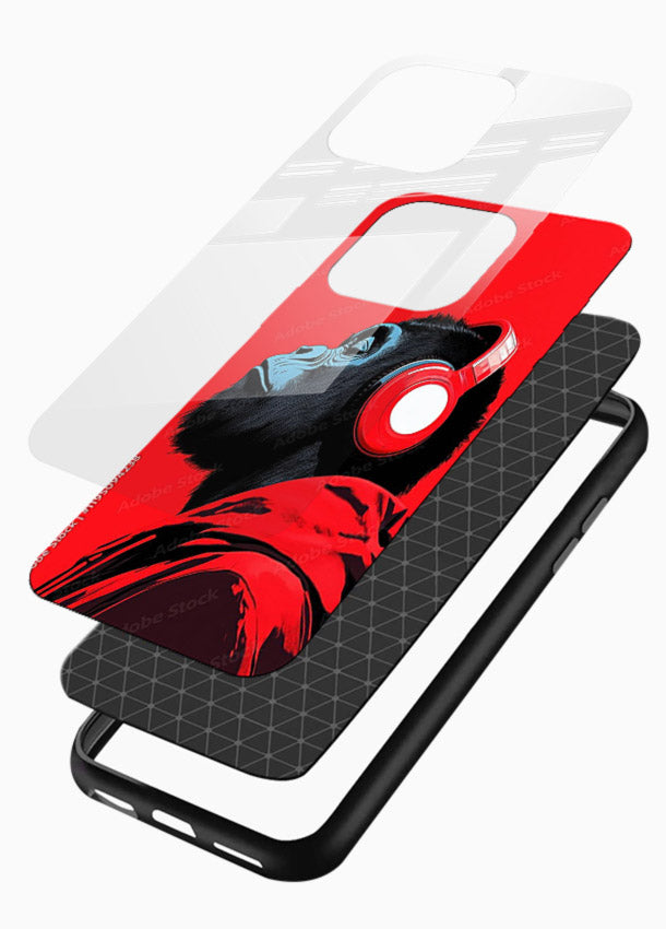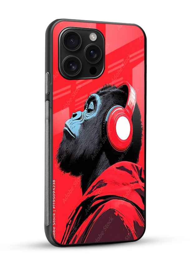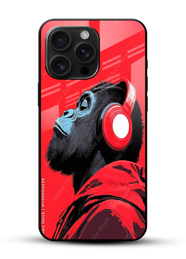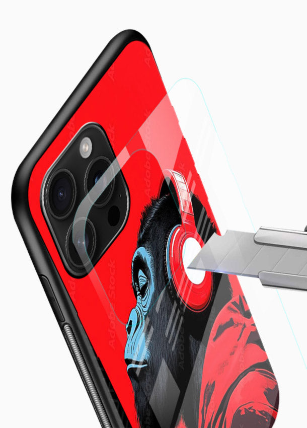 A striking Mobile Glass glass cover with a headphone-wearing red gorilla, perfect for music lovers who enjoy bold colours, strong style and energetic modern artwork.