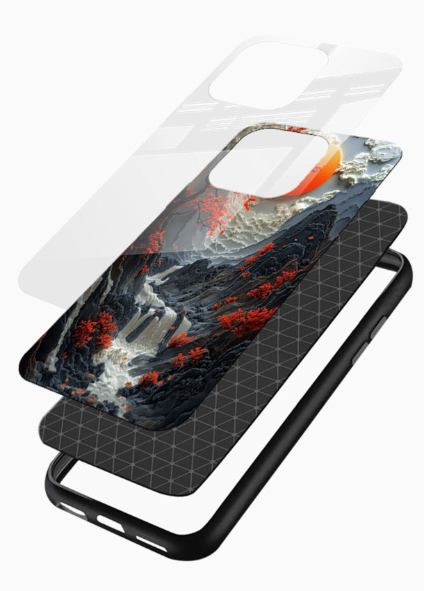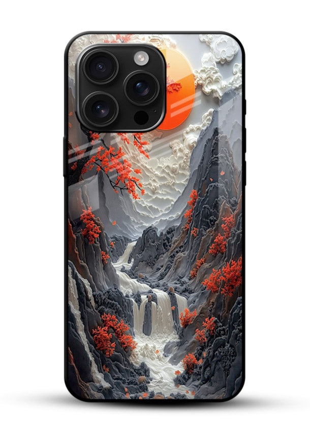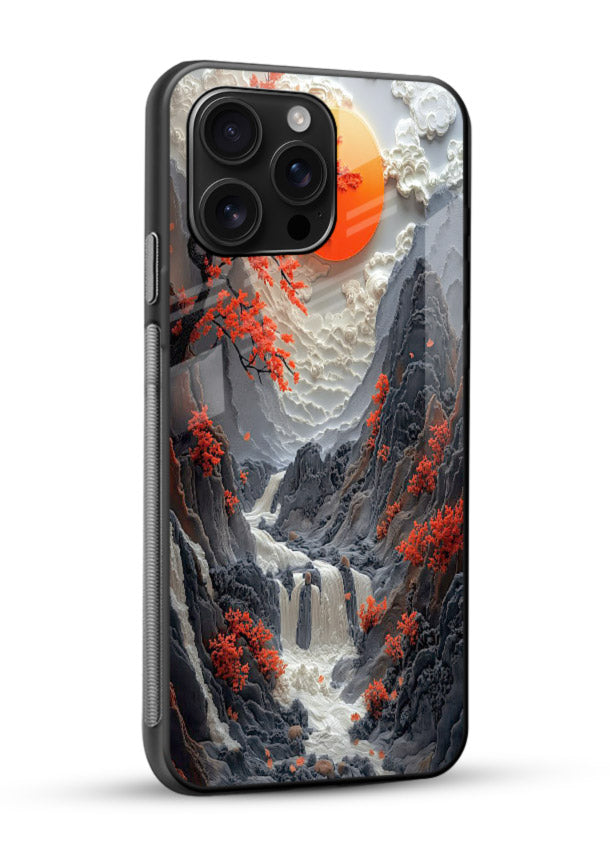 Majestic waterfall surrounded by red maple trees against misty mountains, creating a striking nature aesthetic perfect for your Mobile Glass glass back cover.