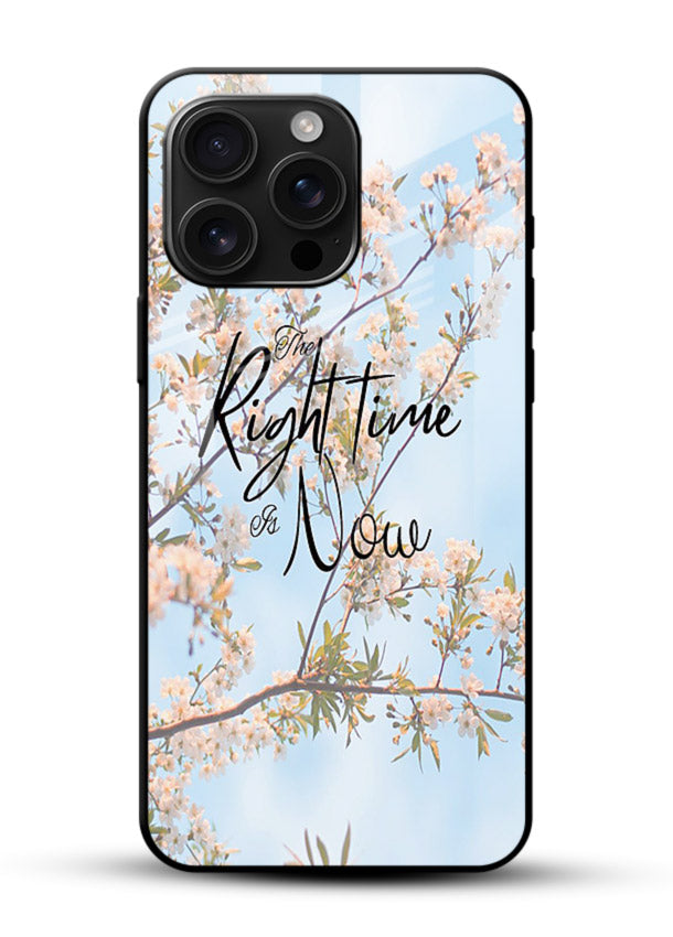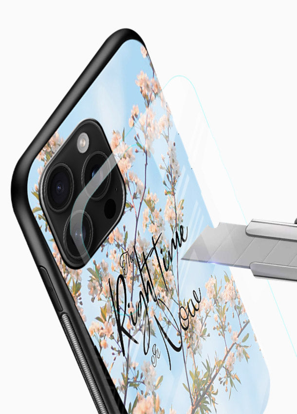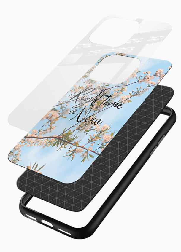 Blooming branches and a timing message create a soothing natural aesthetic on your Mobile Glass glass back cover, inspiring patience, renewal, and calm growth.