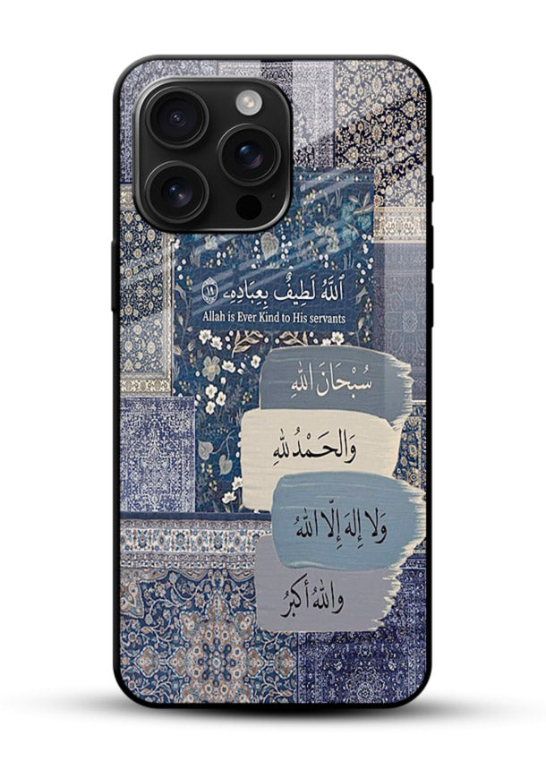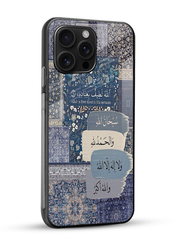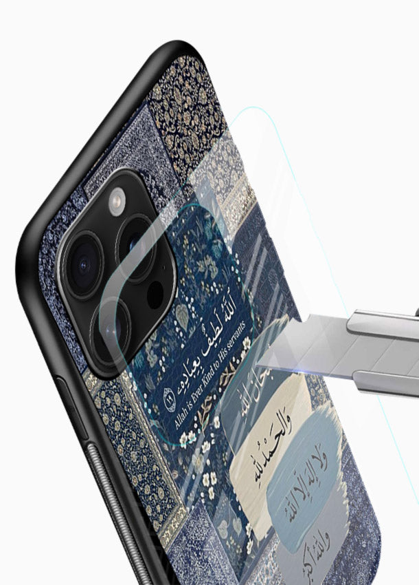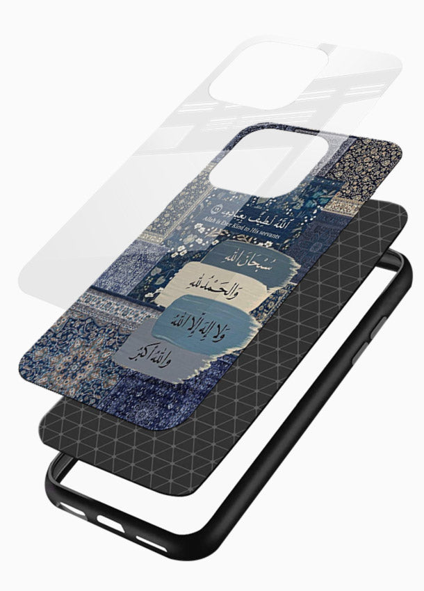 A deep blue ornamental background featuring an inspiring Arabic calligraphy quote. Built with scratch-resistant tempered glass and reinforced bumper protection.