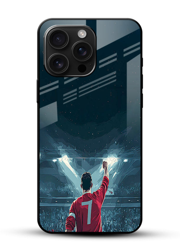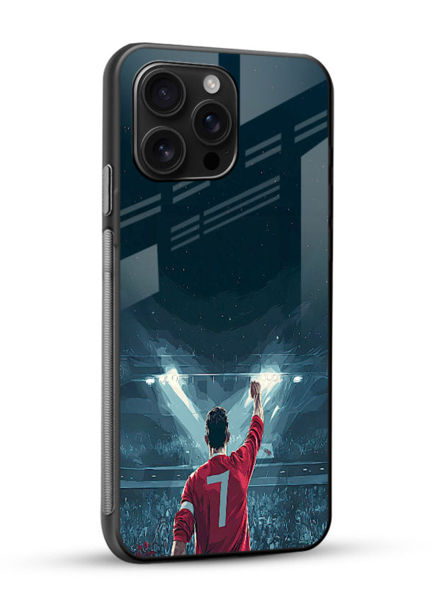 A lone number seven figure under stadium lights capturing iconic match-day energy. Built on scratch-resistant tempered glass with glossy finish and protective bumper sides.