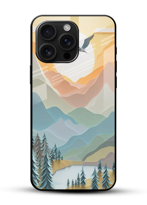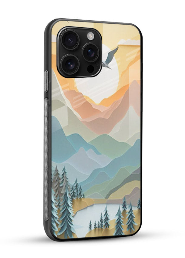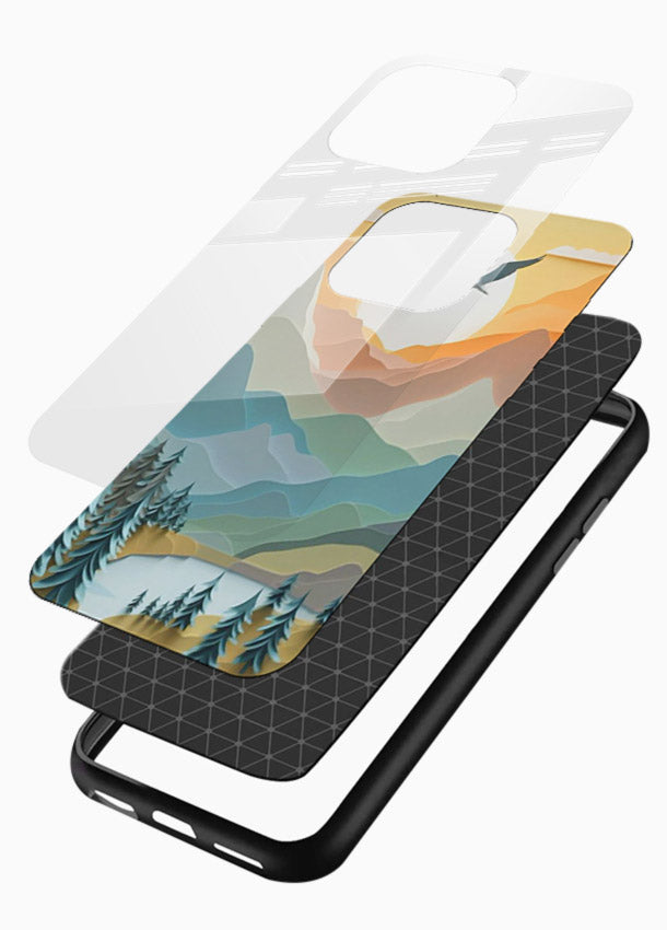 Golden sunrise illuminating distant mountains with birds soaring through warm sky, adding a hopeful scenic aesthetic to your Mobile Glass glass back cover.