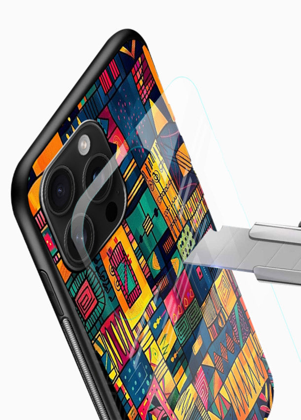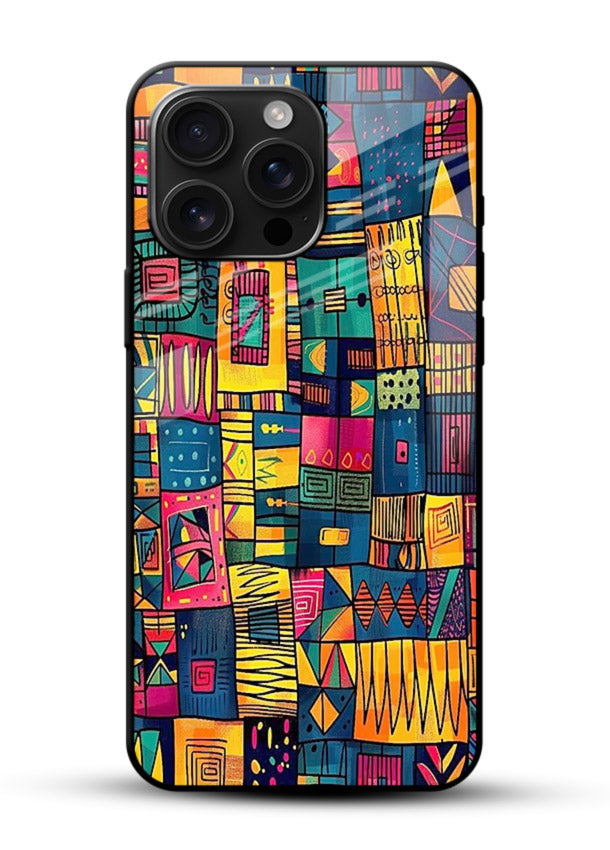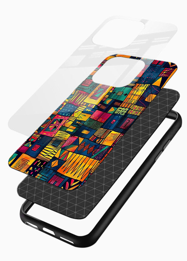 Bold tribal patchwork design with vibrant geometric blocks forming an energetic artistic pattern, delivering a powerful stylish upgrade to your Mobile Glass glass back cover.
