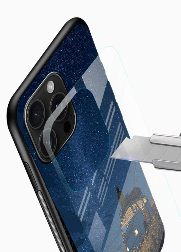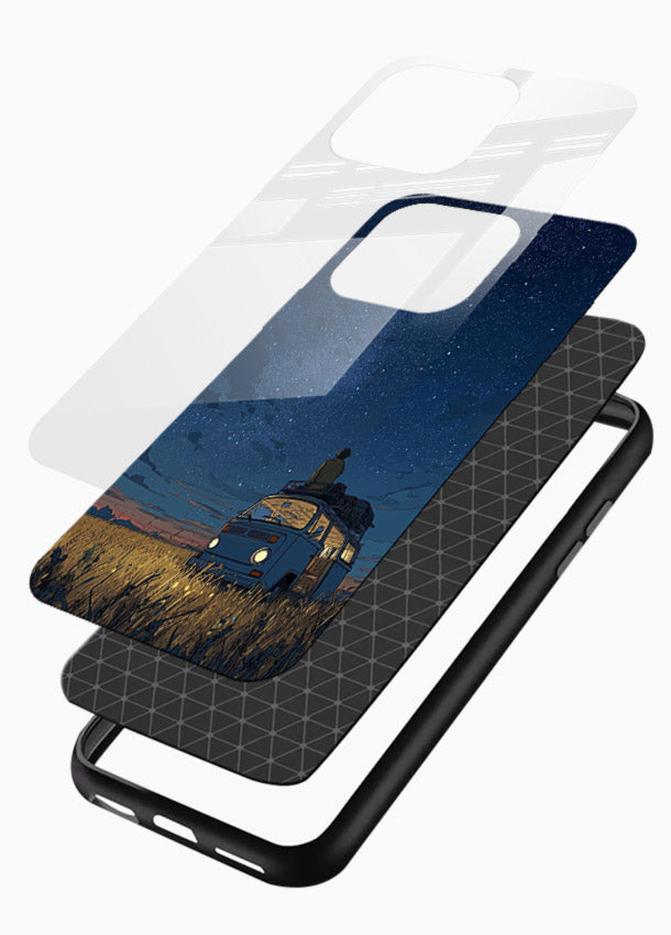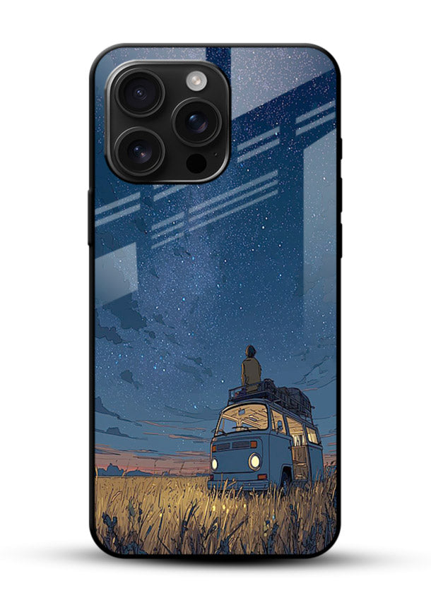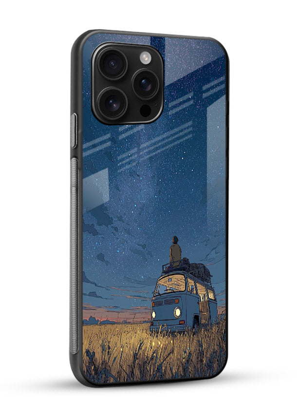 A serene Mobile Glass glass cover showing a van beneath a starry night sky, giving your phone dreamy, aesthetic, adventurous and calming vibes.