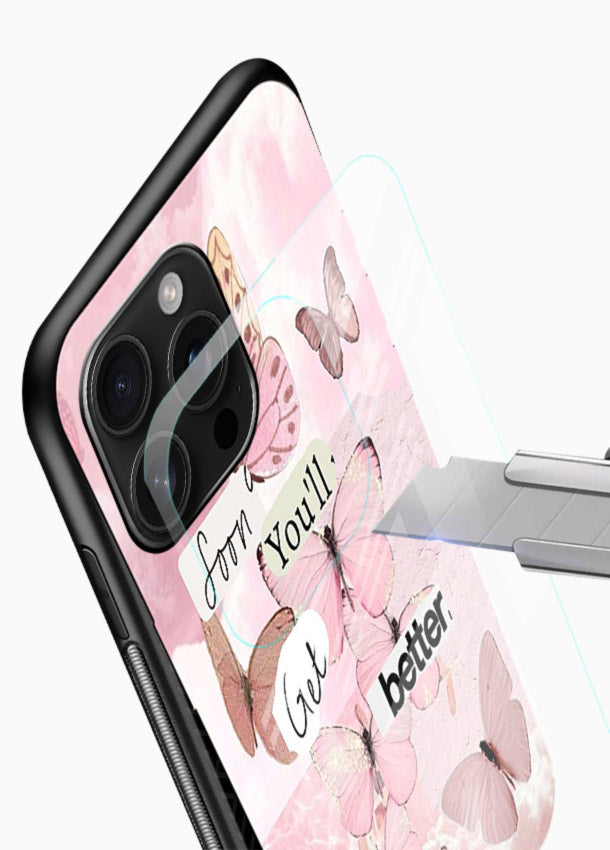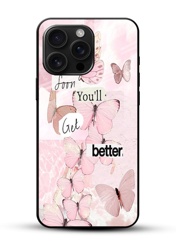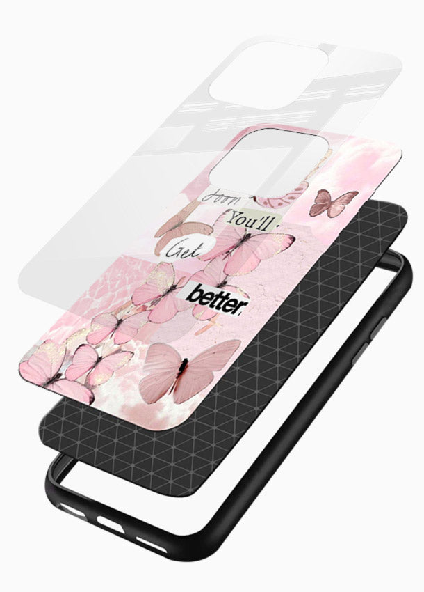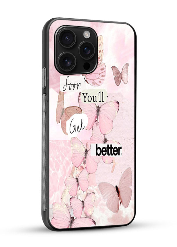Soft butterflies and warm pink tones create a healing atmosphere on your Mobile Glass glass back cover, offering hope, comfort, and gentle emotional progress.